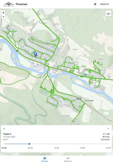 Arbeidet som entrepenørene utfører, antall timer brukt og antall km vei brøytet blir godt dokumentert. Oppdragsgiver kan til enhver tid se status. Tid og penger spart!